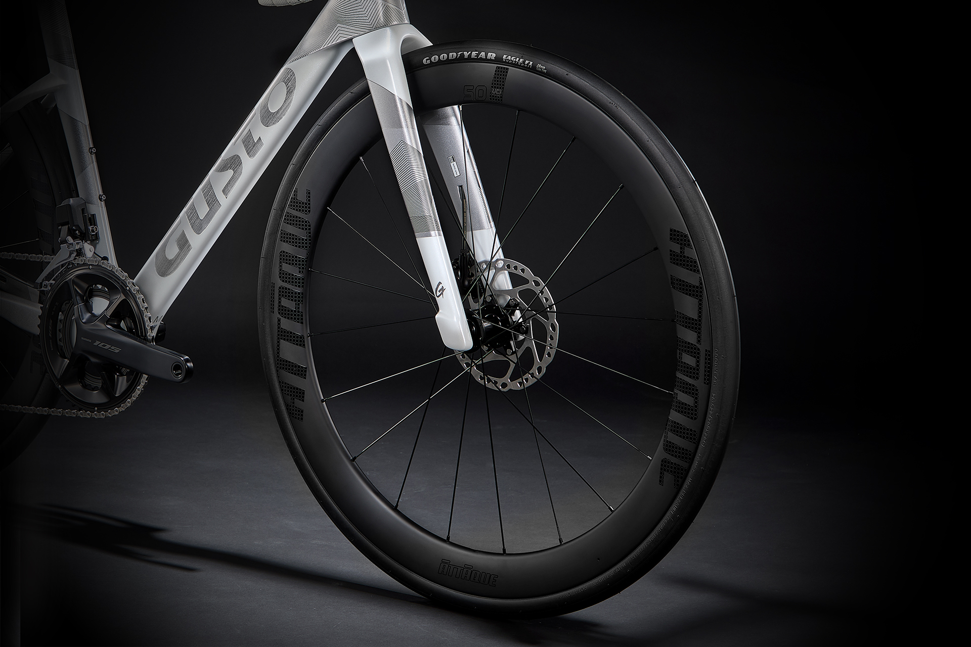 UCI-certified wheelset designed for racing. The wheels feature an aerodynamic design, with special rim surface profile to accelerate the flow of surface turbulence and reduce air resistance. The wheels can accommodate clincher or tubeless tyres, and the hubs are equipped with two-front; four-rear bearings, assembled with aerodynamic spokes, maximizing aerodynamic performance and pedaling power.