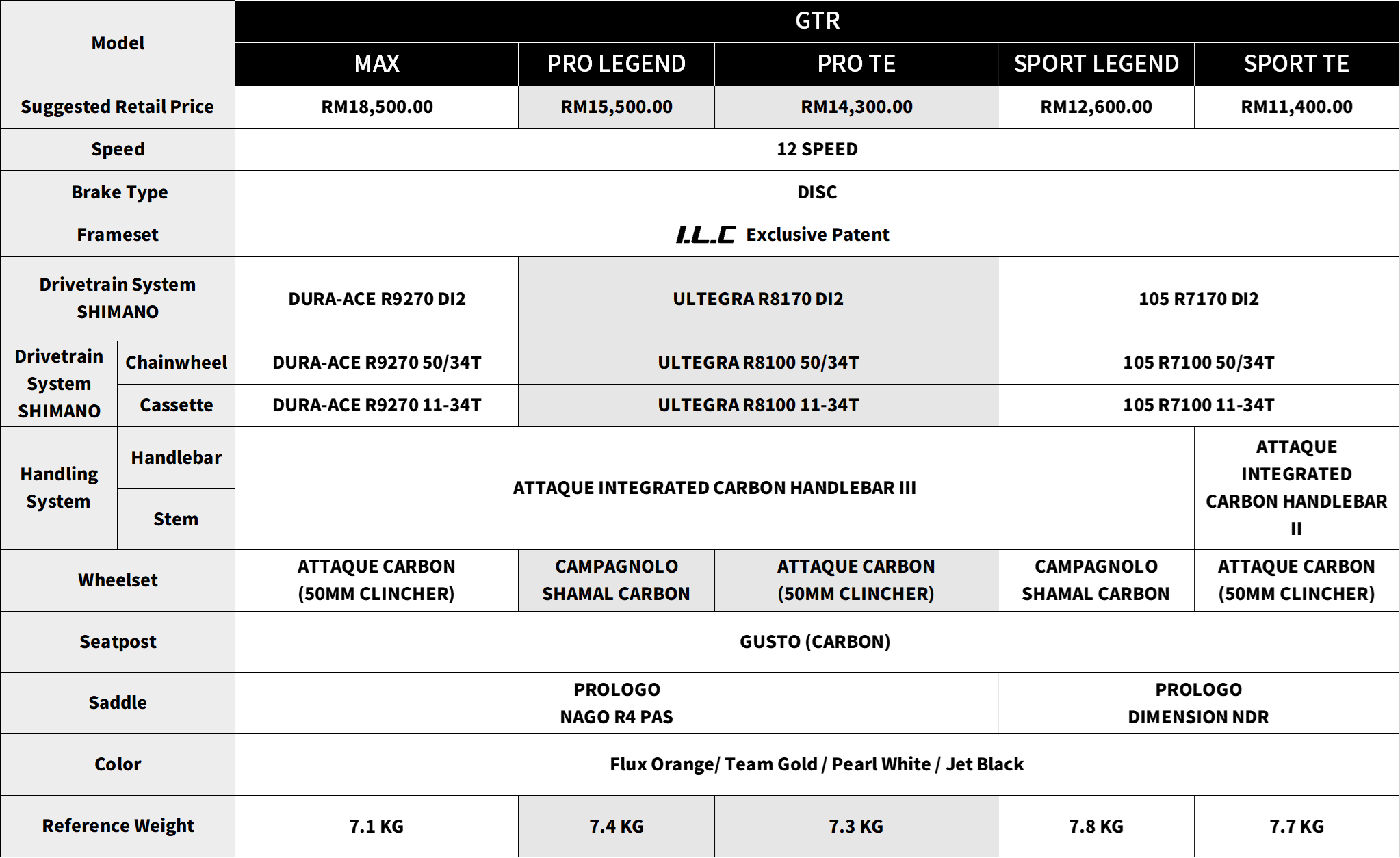 The NEW GTR comes with higher stack and shorter reach geometry, which provides riders, no matter for climbing or long-distance cruising, an aero riding position and reduced cycling stress while maintaining agility for sprints. The rear-based center of gravity design reduces handling fatigue, increases descent stability, prevents cornering understeer, and improves long-distance racing handling. In addition, rear chain stay design is optimized for sprint rigidity and climbing traction.